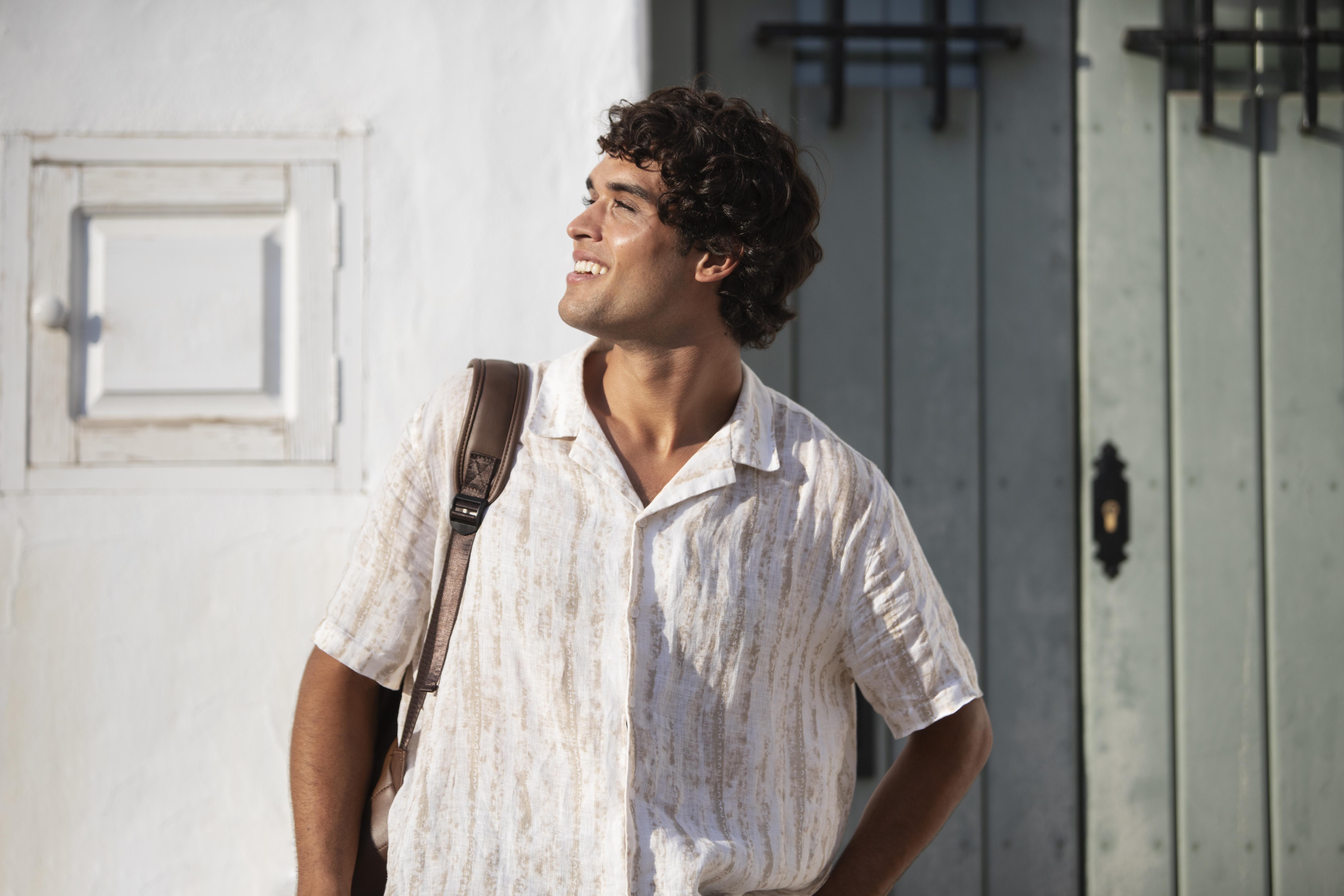“시원한 오픈칼라와 여유로운 핏으로 여름철 어디서든 멋스럽게 입을 수 있는 셔츠”